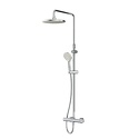 Устройство: душевая система • Смеситель: термостатический • Ручная лейка: размер 110 мм, настройки 3 шт • Верхний душ: размер 220 мм, настройки 1 шт • Комплектация: ручной душ, смеситель, стойка, шланг, крепление ручного душа
