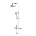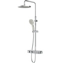 Устройство: душевая система • Смеситель: термостатический, с кнопкой • Ручная лейка: размер 120 мм, настройки 3 шт • Верхний душ: размер 250 мм, настройки 1 шт • Комплектация: ручной душ, смеситель, стойка, шланг, крепление ручного душа, полка