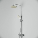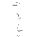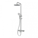 Устройство: душевая система • Смеситель: термостатический • Ручная лейка: размер 120 мм, настройки 3 шт • Верхний душ: размер 250 мм, настройки 1 шт • Комплектация: ручной душ, смеситель, стойка, шланг, крепление ручного душа, полка