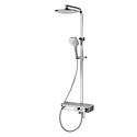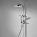 Устройство: душевая система • Смеситель: джойстик • Ручной душ (душевая лейка): размер 120 мм, настройки 3 шт • Верхний душ (тропический): размер 242 мм, настройки 1 шт • Комплектация: ручной душ, верхний душ, смеситель, стойка, шланг, крепление ручного душа, полка