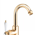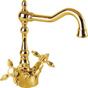 Назначение: для умывальника • Конструкция: двухрычажный • Монтаж: горизонтальный • Материал: латунь, покрытие - золото • Подводка: гибкая • Монтажные отверстия: 1 отверстие • Форма излива: традиционная • Душевая лейка в комплекте: нет • Аэратор: есть • Донный клапан в комплекте: есть