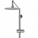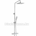 Устройство: душевая система • Смеситель: термостатический • Ручная лейка: размер 110 мм, настройки 3 шт • Верхний душ: размер 250 мм, настройки 1 шт • Комплектация: ручной душ, смеситель, стойка, шланг, крепление ручного душа, полка