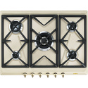 Поверхность: варочная панель • Тип поверхности: газовая • Число конфорок: 5 • Установка: независимая • Газовые конфорки: всего - 5 (1 конфорка "Двойная корона") • Газ-контроль конфорок: есть • Тип управления: механическое • Переключатели: поворотные • Электроподжиг: есть, автоматический • Размеры: 685x500x32 мм • Размер ниши для встраивания: 560x482 мм • Цвет: панель - медь