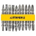 Артикул № 740052 Набор бит Stayer Master 10шт 2605-H10_z01 Набор двухсторонних бит используется в качестве насадок для механизированного и ручного инструмента. При изготовлении бит использовалась Cr-V сталь, что гарантирует износостойкость и прочность, а термообработка и закалка придали им необходимую твердость и долговечность. Пластиковый держатель служит для удобства хранения и транспортировки. В наборе биты с профилем SL, PH и PZ.