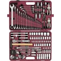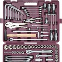 КомплектацияГоловки торцевые 1/4"DR, 9 шт. 4, 4.5, 5, 5.5, 6, 7, 8, 9, 10 ммГоловки торцевые 1/4"DR внешний TORX®, 5 шт. E4, E5, E6, E7, E8Трещоточная рукоятка 1/4"DR 150 мм, 48 зубцовВороток т-образный 1/4"DR 110 ммШарнир карданный 1/4"DR 35 ммУдлинители 1/4"DR, 3 шт. 50, 100, 150 ммГибкий удлинитель 1/4"DR 150 ммОтверточная рукоятка 1/4"DR 150 ммАдаптер для вставок-бит 1/4"DR х 1/4"НDRВставки-биты 1/4"HDR L=25 мм, 26 шт. (РН) 0, 1, 2, 3; (PZ) 0, 1, 2, 3; (SL) 4, 5.5, 7 (H) 2, 3, 4, 5, 6, 7, 8, 10 мм (T) Т10, Т15, Т20, Т25, Т27, Т30, Т40Головки торцевые 3/8"DR, 15 шт. 6, 7, 8, 9, 10, 11, 12, 13, 14, 15, 17, 18, 19, 21, 22 ммТрещоточная рукоятка с гибкой головкой 3/8"DR 250 мм, 48 зубцовУдлинители 3/8"DR, 2 шт. 75, 150 ммШарнир карданный 3/8"DR 50 ммАдаптер трехстороннийГоловки торцевые 1/2"DR, 19 шт. 8, 10, 12, 13, 14, 15, 16, 17, 18, 19, 20, 21, 22, 23, 24, 25, 27, 30, 32 ммГоловки торцевые 1/2"DR внешний TORX®, 5 шт. E10, E12, E14, E16, E20Головки свечные 1/2"DR, 2 шт. 16, 21 ммТрещоточная рукоятка 1/2"DR 250 мм, 48 зубцовВороток гибкая рукоятка 1/2"DR 375 ммВороток г-образный двусторонний 1/2"DR 250 ммУдлинители 1/2"DR, 2 шт. 75, 250 ммШарнир карданный 1/2"DR 70 ммАдаптер трехсторонний 1/2"DRКлючи комбинированные, 17 шт. 6, 7, 8, 9, 10, 11, 12, 13, 14, 15, 16, 17, 18, 19, 21, 22, 24 ммКлючи разрезные, 5 шт. 8х10, 10х12, 11х13, 12х14, 17х19 ммКлючи торцевые шестигранные, 10 шт. 2.5, 3, 4, 5, 6, 7, 8, 10, 12, 14 ммОтвертки 6 шт. (РН) 2х38 мм, 2х100 мм, 2х100 мм (ударная) (SL) 6х38 мм, 6х150 мм, 6.5х150 мм (ударная)Молоток 0,3 кгПассатижи 175 ммРучные тиски 250 мм