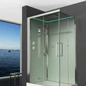 Закрытая кабина, полностенная, правосторонняя, двери раздвижные, материал поддона: акрил, материал стенок: стекло, турецкая баня, тропический душ, вертикальный гидромассаж, габариты (ШхВхД): 90x220x120 см