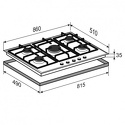 Поверхность: варочная панель • Тип поверхности: газовая • Число конфорок: 5 • Установка: независимая • Газовые конфорки: всего - 5 (1 конфорка "Тройная корона") • Газ-контроль конфорок: есть • Тип управления: механическое • Переключатели: поворотные • Электроподжиг: есть, автоматический • Размеры: 860x520x50 мм • Размер ниши для встраивания: 810x490 мм • Цвет: панель - нерж.сталь