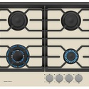 Поверхность: варочная панель • Тип поверхности: газовая • Рабочая поверхность: закаленное стекло • Число конфорок: 4 • Установка: независимая • Газовые конфорки: всего - 4 (1 конфорка "Тройная корона") • Газ-контроль конфорок: есть • Тип управления: механическое • Переключатели: поворотные • Электроподжиг: есть, автоматический • Размеры: 590x520x50 мм • Размер ниши для встраивания: 560x490 мм